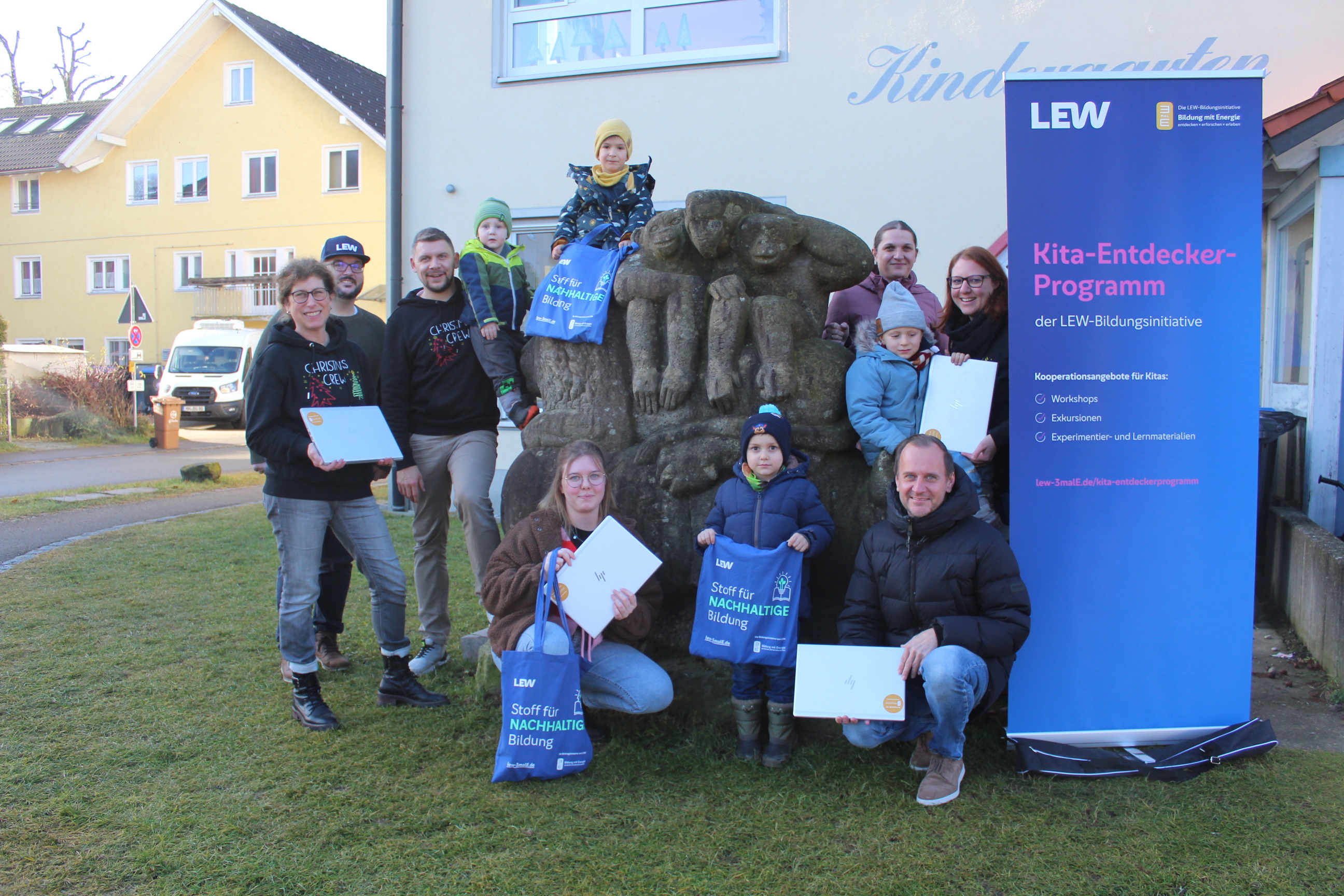In der Kita Arche Noah aus Legau können die Kleinsten künftig ganz große Schritte in Richtung Zukunft machen. Denn Stefan Stölzle, Mitarbeiter der LEW, überreichte am Dienstag, 09.12.2025, im Rahmen des LEW Programms 4 Laptops an die Kita Mitarbeiter, Bürgermeister Thomas Heinle und die Kinder. Die Arche Noah Kita hatte sich im Rahmen des KITA-Entdecker-Programms der LEW-Bildungsinitiative 3malE für die Computer beworben – und per Los den Zuschlag erhalten und 4 Laptops gewonnen! In unserer zunehmend digitalisierten Lern- und Arbeitswelt sammeln Kinder meist schon im Kindergartenalter erste Erfahrungen mit digitalen Geräten – idealerweise pädagogisch begleitet. Die PCs ermöglichen einerseits den Vorschulkindern den Zugang zur digitalen Welt mit all ihren kreativen und lehrreichen Dimensionen und unterstützen andererseits die administrative und pädagogische Arbeit der pädagogischen Fachkräfte. Wir freuen uns über den Gewinn sehr und bedanken uns nochmal ganz herzlich bei den Lechwerken für die Laptops!
